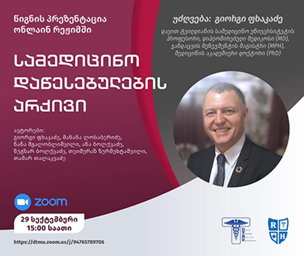 წიგნის ონლაინ პრეზენტაციას უძღვებოდა გიორგი ფხაკაძე / დავით ტვილდიანის სამედიცინო უნივერსიტეტის პროფესორი, დიპლომირებული მედიკოსი (MD), ჯანდაცვის მენეჯმენტის მაგისტრი (MPH), მედიცინის აკადემიური დოქტორი (PhD) / წიგნი „სამედიცინო დაწესებულებების არქივი“ გამოიცა დავით ტვილდიანის სამედიცინო უნივერსიტეტის გამომცემლობით.