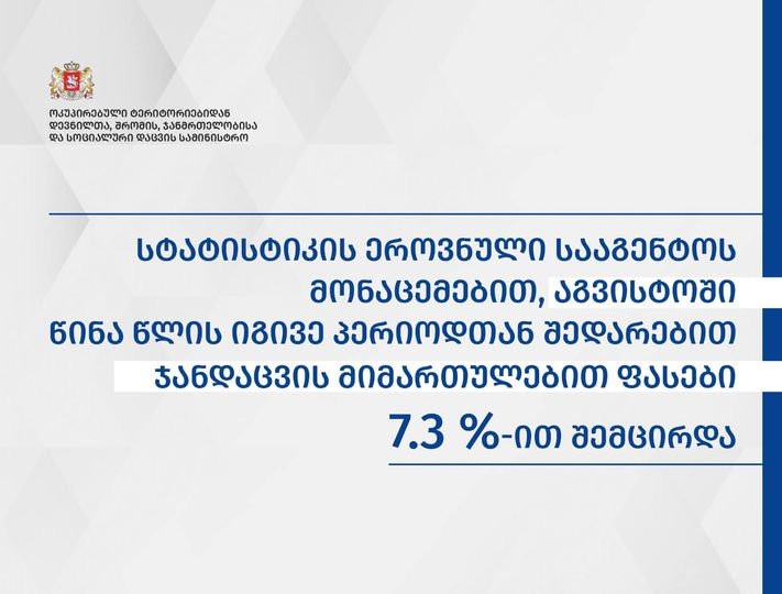 ფასები შემცირდა სამედიცინო პროდუქციის, აპარატურისა და მოწყობილობის ქვეჯგუფზე (-17.6 პროცენტი). ივლისის თვეში, ჯანდაცვის ჯგუფში 6.9 პროცენტიანი კლება დაფიქსირდა, ამასთან, სამედიცინო პროდუქციის, აპარატურისა და მოწყობილობის ქვეჯგუფში -17.3 პროცენტიანი კლება იყო. შესაბამისად, აგვისტოში სამედიცინო პროდუქცია კიდევ უფრო გაიაფდა.