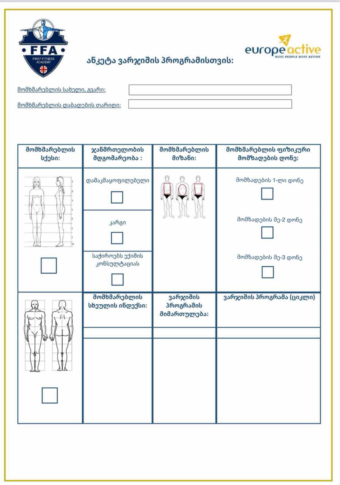 როგორ უნდა გამოიყურებოდეს ვარჯიშის პროგრამის ბლანკი და მომხმარებლის ჯანმრთელობის შესახებ გამოკითხვის ანკეტა?