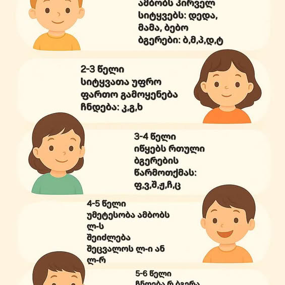 ➡️ თუ 6 წლის ბავშვს „რ“ ჯერ არ აქვს გამომუშავებული, რეკომენდებულია სპეციალისტის ჩართვა, რადგან ეს ბოლო და ყველაზე რთული ბგერაა.