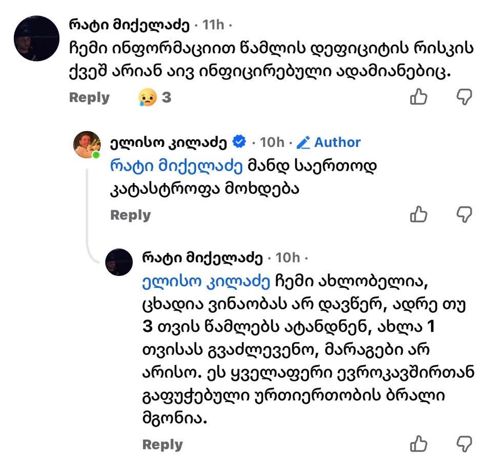 ელისო კილაძე რატი მიქელაძეს კომენტარით პასუხობს: „მანდ საერთოდ კატასატროფა მოხდება.“