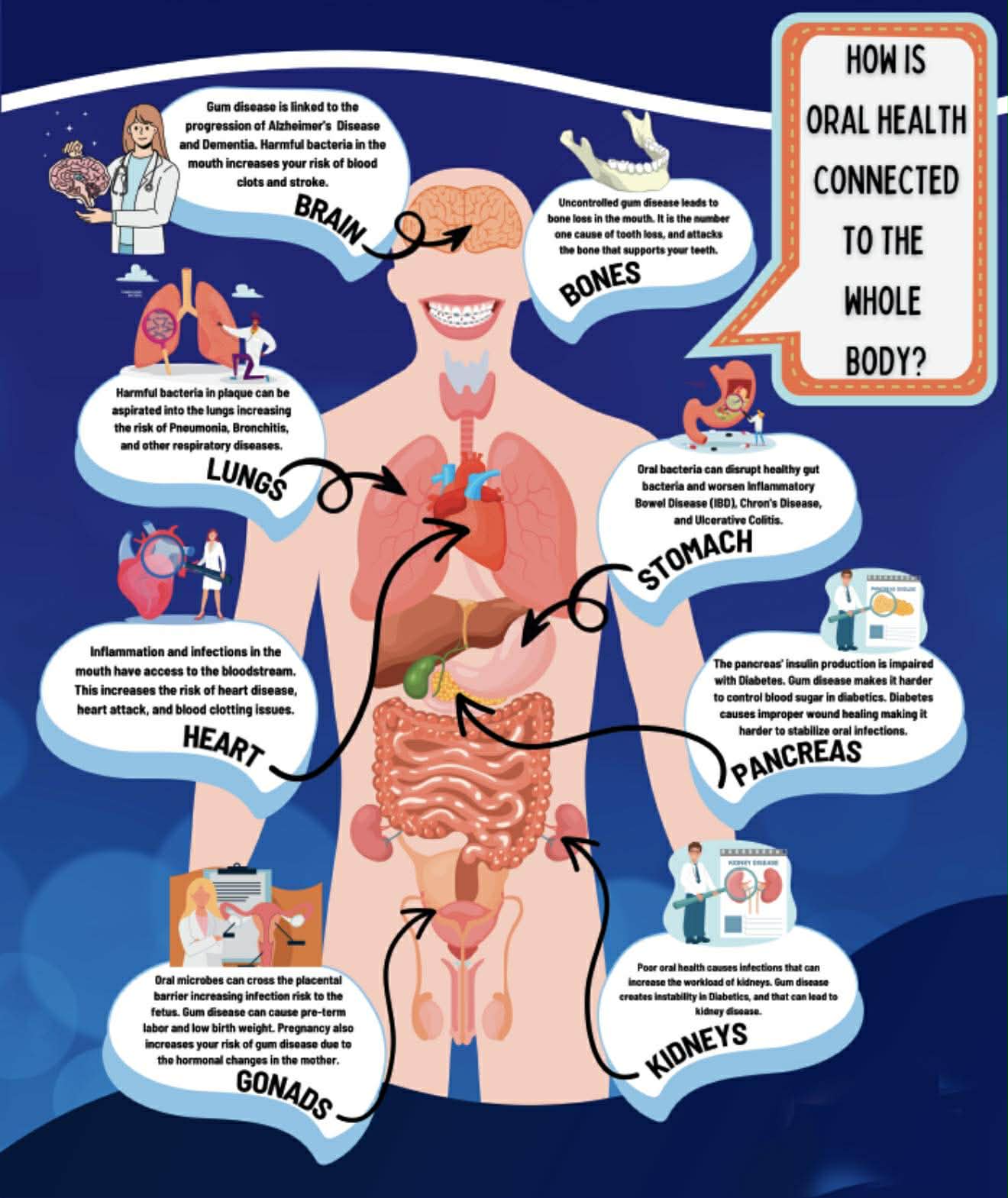 პირის ღრუში არსებული ქრონიკული ანთება (განსაკუთრებით ღრძილების დაავადება ) დაკავშირებულია გულ-სისხლძარღვთა დაავადებებთან, შაქრიან დიაბეტთან, სუნთქვით ინფექციებთან და ორსულობის გართულებებთან.