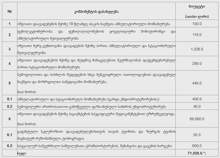 ამასთან, 70 მლნ ლარიდან 71 მლნ 26 ათას ლარამდე გაიზარდა იშვიათი დაავადებების მქონე და მუდმივ ჩანაცვლებით მკურნალობას დაქვემდებარებულ პაციენტთა მკურნალობის პროგრამის ბიუჯეტი.