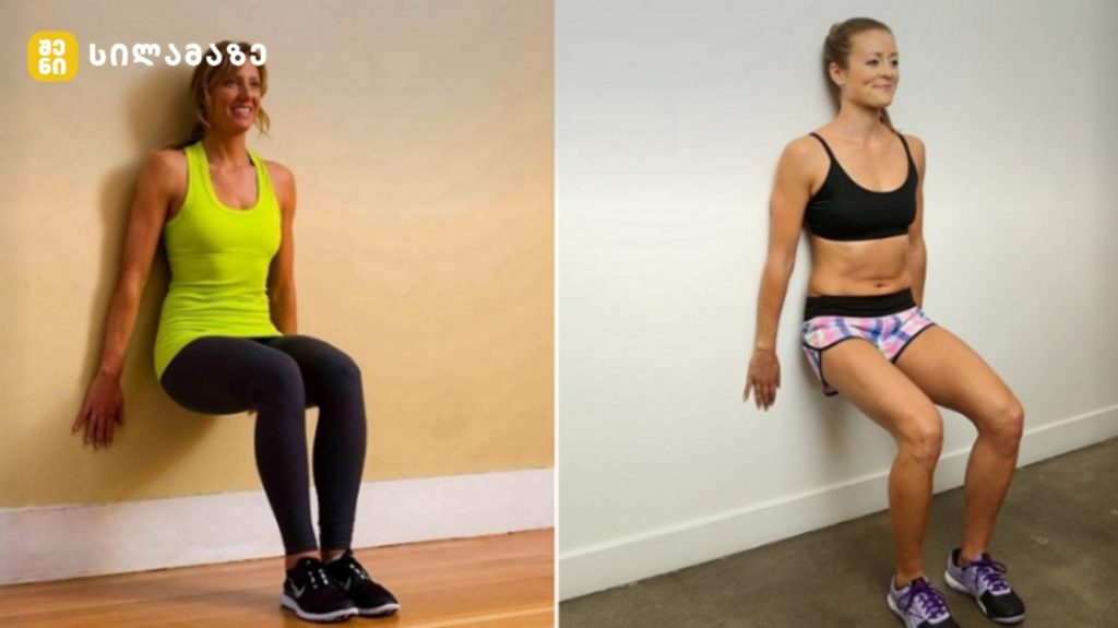 დადექით ზურგით კედლისკენ, გადადგით ერთი ნაბიჯი წინ, ფეხები მოათავსეთ მხრების სიგანეზე. ნელა დაეშვით ქვემოთ, სანამ მუხლები დაახლოებით 90 გრადუსიან კუთხეს არ შექმნის.