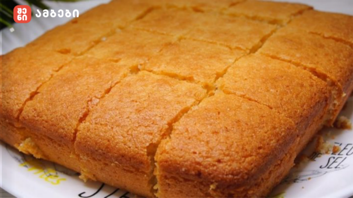 ჩაასხით ცომი ფორმაში (ფორმა უნდა იყოს ცხიმწასმული) და გამოაცხვეთ 180 გრადუსამდე გახურებულ ღუმელში 40 წუთის განმავლობაში. სუფრასთან მიტანის წინ ათქვიფეთ შაქრის პუდრა და ნახევარი ლიმონის წვენი და გადაასხით გაცივებულ ნამცხვარს.