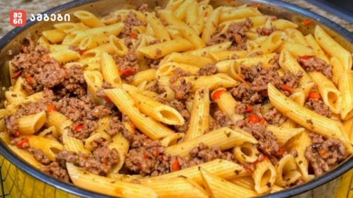 თათრული მაკარონი ხორცით — არომატული ჩაშუშული მაკარონი სოუსში მოხარშული