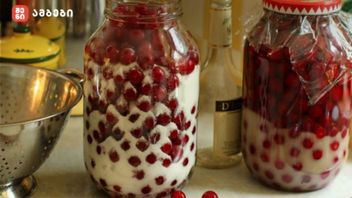 გადაწურეთ სითხე ცალკე ქილაში და შეინახეთ. ალუბალს მოაყარეთ შაქარი, დააფარეთ თავსახური და ისევ 2 კვირით ბნელ ადგილას დადგით.