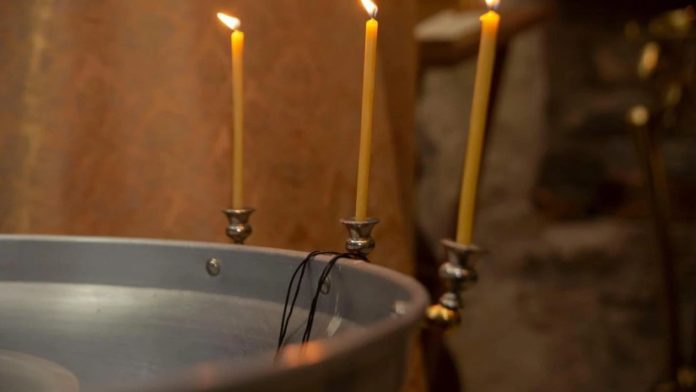 ნათელს იღებს მონა ღვთისა (ან მხევალი) სახელითა მამისათა (დავასხამთ თავზე წყალს) ამინ. და ძისათა, (დავასხამთ თავზე წყალს) ამინ. და სულისა წმიდისათა, (დავასხამთ თავზე წყალს) ამინ. აწ და მარადის და უკუნითი უკუნისამდე, ამინ.