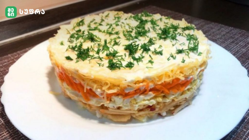 მსუბუქი ფენოვანი სალათი სტაფილოთი, ვაშლითა და ყველით — მარტივი და გემრიელი ალტერნატივა ყოველდღიური სუფრისთვის