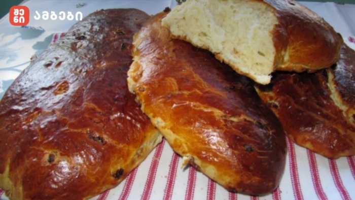 ცომის ზედაპირს წაუსვით რძეში გათქვეფილი კვერცხის გული, რაც გამოცხობის შემდეგ ოქროსფერ შეფერილობას უზრუნველყოფს.