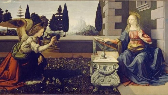 ანგელოზი გაბრიელი აცნობს მარიამს, რომ იგი შვილის დედა გახდება — იესო, რომელიც იქნება ღვთის ძე და ქრისტიანი მესია. მარიამი იკითხავს, როგორ მოხდება ეს, რადგან ჯერ კიდევ ქალწულია, და ანგელოზი პასუხობს, რომ ეს მოხდება წმინდა სულიერი ძალით. მარიამი ეუბნება: „მე უფლის მსახური ვარ.“