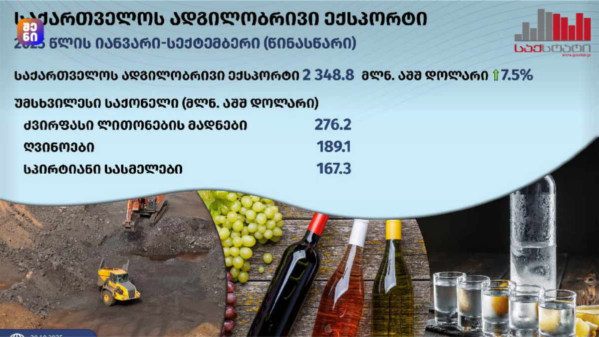 სტატისტიკის ეროვნული სამსახურის მონაცემებით, 2025 წლის იანვარ-სექტემბერში საქართველოდან განხორციელებული საქონლის ექსპორტის მოცულობამ (არადეკლარირებული ექსპორტის გარეშე) 5 151.4 მლნ. აშშ დოლარი შეადგინა, რაც 7.7 პროცენტით მეტია გასული წლის შესაბამისი პერიოდის მაჩვენებელზე.