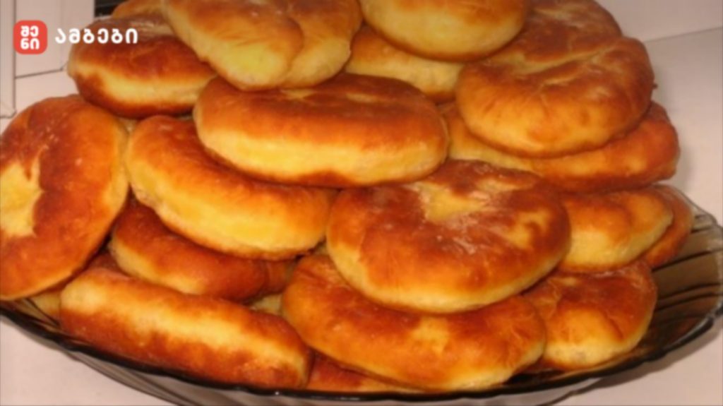 აფუებული ცომი გაყავით თანაბარ გუნდებად. თითოეული გუნდა გააბრტყელეთ საშუალო სისქის ფირფიტის ფორმით, რათა შეწვისას თანაბრად მომზადდეს.