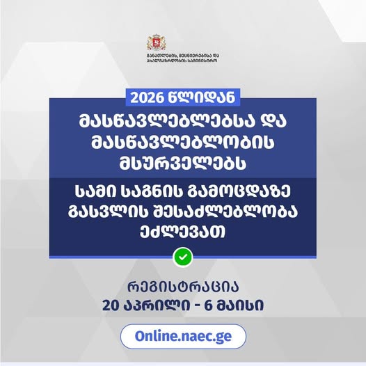 2026 წლიდან მასწავლებლებსა და მასწავლებლობის მსურველებს უფლება აქვთ, ნაცვლად ერთი საგნის გამოცდისა, დარეგისტრირდნენ და ჩააბარონ არაუმეტეს სამი საგნის გამოცდა და ასევე, უფროსი სპეციალური მასწავლებლისა და საბაზო პროფესიული უნარების გამოცდები.