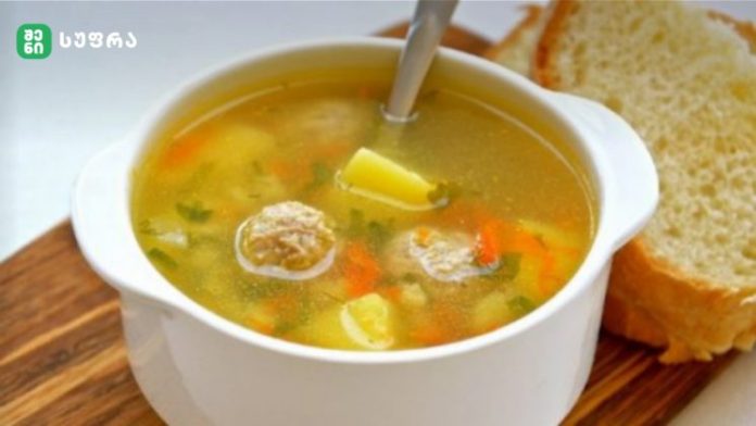 ადუღებულ წყალში ჩაყარეთ გახეხილი სტაფილო და დაჭრილი კარტოფილი. ხორცისგან გააკეთეთ გუფთები, როცა კარტოფილი ნახევრად მოიხარშება, ჩაყარეთ გუფთები, ბრინჯი, დაფნის ფოთოლი, მარიი და პილპილი გემოვნებით. როცა ხორცი და ბრინჯი მოიხარშება, შეანელეთ დაჭრილი მწვანილით. გემრიელად მიირთვით.